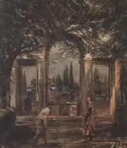 View of the Garden of the Villa Medici is the title of an oil painting by Spanish artist Diego Velázquez, as well as its pendant piece. Critics maintain that the work was created during one of his two trips to Italy—likely his second visit in 1649–1650. The paintings depict quiet, atmospheric scenes of the Villa Medici gardens in Rome, focusing on architectural details and natural light rather than narrative or mythological themes, which were more typical of the time. In one painting, known as Afternoon, two men converse near a boarded-up stone archway, while in the smaller pendant, Midday, a gardener speaks with a cleric near a gated entrance.