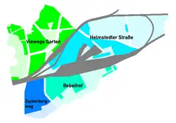 The district of Viewegsgarten-Bebelhof was established in 1981.[3] It is named after Bebelhof, a working-class quarter built in the 1920s[4] and the urban park Viewegs Garten, established in the late 18th century.
