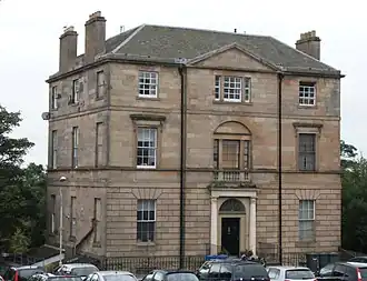 Viewfield House was built in about 1808 for James Blackwood, Provost of Dunfermline,[note 1] but has been altered repeatedly since then. It consists of three storeys with a pitched roof of grey slate, flat in the centre, containing an attic. The house has three bays: the central bay has a shallowly projecting pediment. There are Palladian windows on the first floor. The house is built of sandstone in ashlar blocks, the ground floor has a rusticated exterior and the basement is rockfaced.[1]