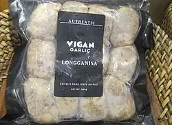 Vigan longganisa, also known as the Ilocano longganisa, is a Filipino pork sausage originating from Vigan City, Ilocos Sur. It is a type of de recado longganisa noted for its salty, garlicky, and sour flavor. It is air-dried, made with ground lean pork, annatto, coarsely ground pork and fat, brown sugar, garlic, onions, bay leaves, soy sauce, vinegar, black pepper, and salt to taste in hog casings. Chili flakes may also be added. The sausages are celebrated in an annual "Longganisa Festival" in Vigan City.[1][2][3][4][5][6]