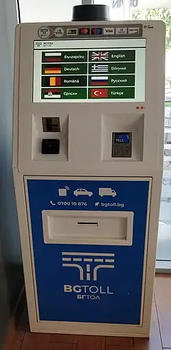 Vignettes are required for all (except motorcycles) vehicles driving on all public roads, with the exception of streets in cities, towns and villages. Vignettes are usually valid from the time they are purchased, while some types can be marked to start from a future date. They can be obtained in Bulgaria at most gas stations, at border crossings, or online using a credit card.[7] Cash fines from €150 to €1,500 are charged to drivers without a valid vignette.[8] The vignette sticker was replaced by e-vignette on 1 January 2019, and an e-toll system is to be introduced in August 2019 for vehicles heavier than 3.5 tonnes.[9]