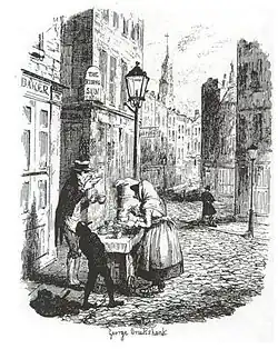 Aside from journalism, vignettes in the form of the “literary sketch” became popularised in the Victorian era by authors such as William Makepeace Thackeray and Charles Dickens, and their works would often appear in newspapers and magazines.[5] Works such as Sketches by Boz by Charles Dickens, and Thackeray’s Vanity Fair: Pen and Pencil Sketches of English Society, drew heavily from the original definition of a sketch in the visual arts by creating a sense of spontaneity, freedom and authenticity.[5] These sketches sometimes included visual illustrations by George Cruikshank, and were viewed as rough drafts rather than complete works of literature - a necessary step towards creating a finished work, but not inferior to a finished work.[5] The fragmentary and immediate style of these vignettes reflected the 19th century’s sense of economic and social instability, and the rapid pace of urban life.[5]