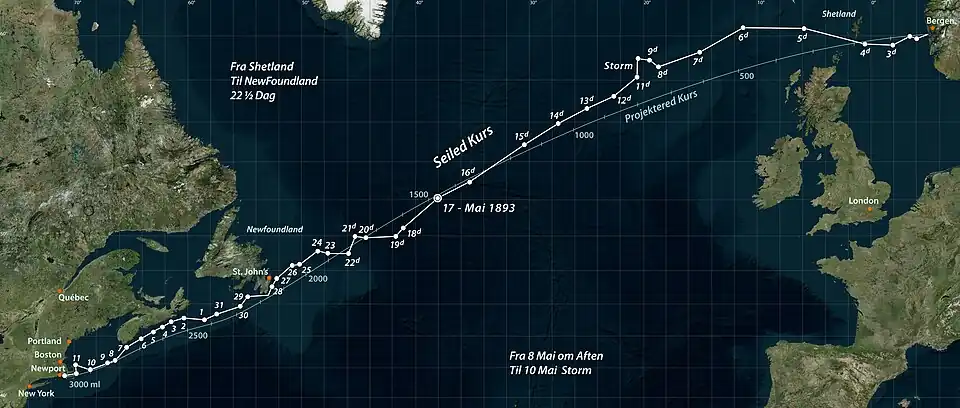 Viking sailed to North America, via Newfoundland and New York, up the Hudson River, through the Erie Canal and into the Great Lakes to Chicago, where the World's Columbian Exposition was taking place in 1893 to commemorate the discovery of America by Columbus. Carter Harrison III, Chicago's four-term mayor, boarded and took command for the last leg of the voyage, arriving at Jackson Park on Wednesday, July 12, 1893 to much fanfare.[5]