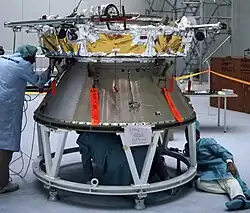 Space was limited underneath the SPOT 1 satellite, and Viking had to be quite sturdy in order to withstand the stress of launch. The basic shape of the Swedish satellite was a flat octagonal disc, 0.5 metres thick and 1.9 metres across.[4] The mechanical interface of the payload adapter from the Ariane rocket was duplicated on top of Viking. This enabled it to be added to the launch with a minimum of redesign of the SPOT satellite. The satellite was developed by SAAB Space with Boeing Aerospace as a major subcontractor.