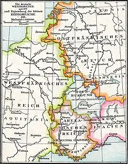 The heartland of the Carolingians lay, for the most part, in territories that were part of the Rhineland. As a result, important sites of Carolingian culture are located here. Of particular note are the city of Aachen, where Charlemagne had his imperial palace built, and also the Benedictine abbey in Prüm – the latter mainly because of its scriptorium and associated library. The old Roman cities of Trier, Cologne, Xanten and Bonn were also located in the Rhineland and were used by the Franks as centres of trading and episcopal seats. In 843 AD, the Frankish Empire was divided into three kingdoms. Most areas of the Rhineland fell into the dominion of Lothair I and were named Lothringen. This was the middle kingdom that ran from the North Sea to the Mediterranean Sea with no border crossings between East and West Francia. After this division of the empire, almost all areas of the former great empire experienced conflicts over power of a civil warlike nature. The Rhineland was also affected by this. When Lothair I died in 855 without an heir to his throne, the power struggles intensified. In 870, following the Treaty of Meersen, the Rhineland was assigned to East Francia. Ten years later, the Treaty of Ribemont specified the boundaries more precisely. The map opposite shows the result.[3]