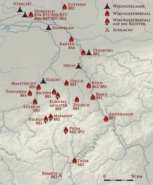 In late 881, Vikings, who had overwintered in Flanders, set off on a military expedition to neighbouring lands. They raided numerous villages in the area of the Meuse and razed the towns of Liège, Maastricht and Tongeren to the ground.[11]