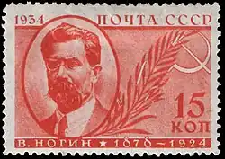 Viktor Pavlovich Nogin (Russian: Ви́ктор Па́влович Ноги́н; 14 February [O.S. 2 February] 1878 – 22 May 1924) was a Russian Bolshevik revolutionary, Soviet politician, and statesman in Moscow, holding many high positions in the party and in government, including Chairman of the Moscow Military Revolutionary Committee and Chairman of the Presidium of the Executive Committee of Moscow Council of Workers' Deputies (Mayor of Moscow). He was a member of first the Council of People's Commissars, i.e., the first Government of Soviet Russia, as People's Commissar for Commerce and Industry.[1]