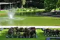Fourteen years later a heated pond to the presentation of tropical aquatic plants was installed, being a reminiscent of the jungle-like structures of the Brissago Islands. The border and scenic shore planting mark the transition into the native flora with subtropical and some flowering plants. The transformation of the flower terrace was done in 1923. A larger well should be built, and Hermann Haller created a bronze sculpture on the base of the old fountain. In 1933, the largest rebuilt of the park took place with the extension of the Alfred-Escher-Strasse to Wollishofen, therefore in the north an area of 1,500 square meters and in the south around 2,100 square meters went lost. The Chestnut as well as the Elm trees had been cut without substitution, the tennis courts disappeared, and a new entrance was built. Only the lakeside entrance to the Park still corresponds to the park borders around 1830.[2]