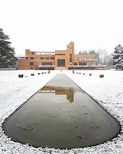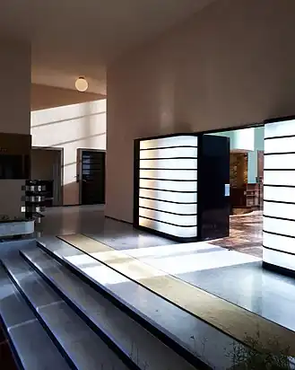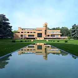 The entrance of the estate is situated in the north-west corner of the terrain, displaced in relation to the main facade of the building. A round driveway enabled the cars to reach the garage, located in the caretaker's lodge, without having to manoeuvre.[3] The villa introduce itself as yellow brick shell and it is the only realisation of Mallet-Stevens to have a similar frame. The French firm Bonzel produced twenty-six moulds of different form in order to make bricks capables to cover the diverse areas of the villa. The source of inspiration of this brick is the town hall of Hilversum, in the Netherlands, realized by the architect Willem Marinus Dudok.[2] If the aesthetic canon of the villa is resolutely modern (large glass windows, flat-roofs, total absence of decoration, purity of lines), its plan is in line with the French tradition of the 17th- and 18-century châteaux: two symmetrical wings (the parents' wing and the children and household staff wing) evolve around the central corp of the villa, constituted by the vestibule and the hall salon.[4] The plan of the villa is designed to facilitate the displacements and to organise the domestic life in a rational way. In the ground floor, the vestibule is a vast room used to distribute the spaces. The black door that opens to the hall-salon is framed by a pair of light boxes which look like those that Mallet-Stevens designed for the set of Marcel L'Herbier's movie Le Vertige. The hall-salon is a big double-height cubic room with a large glass window overlooking the park. The floor is covered with parquet and the walls are painted green. On the east side is situated the fireplace alcove wrapped in yellow Siena marble and set up with leather banquettes. Thanks to a sliding door situated on the west side one can reach the parents' dining room, which is characterised by the walls and the floor in green Swedish marble and the black lacquered pear wood furniture. Adjoining to the parents' dining room, the children's dining room is furnished with a table and six chairs in zebrawood (originals). This room has an independent access to the garden thanks to the exterior corkscrew stairs. from the two dining rooms one can gain access to the pantry and the kitchen. This spaces demonstrate the importance of hygiene in the conception of a modern house by Robert Mallet-Stevens as it is shown by the presence of a metal furniture, easy to clean, the black-and-white chequerboard floor and the walls covered with white tiles bringing additional luminosity. Still in the ground-floor, in the east wing, Paul Cavrois' study, furnished with varnished natural pear wood, give access to the smoking-room, a little circular room calling to mind a cabin of a liner that is provided with a cigar and alcohol cabinet in natural Cuban mahogany and leather bench seats. The east end of the ground-floor is occupied by the two young men's rooms, one with an intense and living polychromy of the walls, a tribute to the Dutch artistic movement De Stijl, and the other one with the walls painted in different shades of yellow and the furniture in black-and-white ceruse oak wood.