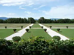 Palladio emphasises the usefulness of the lay-out in his treatise. He points out that the grain stores and work areas could be reached under cover, which was particularly important. Also, it was necessary for the Villa Emo's size to correspond to the returns obtained by good management. These returns must in fact have been considerable, for the side-wings of the building are unusually long, a visible symbol of prosperity. The Emo family introduced the cultivation of maize on their estate (and the plant, still new in Europe, is depicted in one of Zelotti's frescoes). In contrast to the traditional cultivation of millet, considerably higher returns could be obtained from the maize.[5] It is not clear if the long walk, made of large square paving-stones, which leads to the front of the house, served a practical purpose. It seems to be a fifteenth-century threshing floor.[6] However, Palladio advised that threshing should not be carried out near a house.
