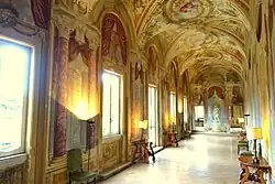 The Villa is notable for its internal decoration, which has taken place in three periods, corresponding to families who owned the building. In the first period, around 1590, Ottavio Acquaviva commissioned the decoration of the rooms on the main floor, which were completed by 1612. These rooms are now believed to be the work of Agostino Ciampelli (1565–1630), who depicted the villa with paintings of rural life and rustic scenes. The second period corresponds to ownership by the Montalto family. Cardinal Alessandro Montalto commissioned the central panel of the room's vault, which portrays the biblical theme of Eliah and Elyseus in a fresco by painters from the Bologna school. The third period dates to the Odescalchi period; most notably, the first-floor gallery, now known as "Pannini Gallery", was created by Giovanni Paolo Panini. An inventory of the Villa, dated 1743, describes this gallery and names Pannini as its painter.