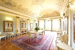 The villa's elliptical staircase is made of brick embellished with fake marble decorations. The staircase starts on the ground floor, with two identical flights to the principal, or noble, floor above. The lighting is enhanced by Swarovski crystals. A modern elevator has been installed in the left wing of the palace, running from the ground floor to the top floor.