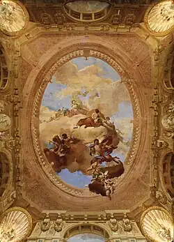 - The top band contains architectural trompe-l'œil, which gives a sense of perspective to the whole. The lateral monochrome paintings are of statues representing Abundance and Justice. The satyrs above the doors evoke the four seasons.