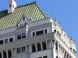 Built in 1928 at a cost of $2.75 million,[2] the Villa Riviera is a 16-story French Gothic Building. The steel-framed[3] structure is topped with a steeply pitched verdigris copper roof. The building was designed by architect Richard D. King who won a grand prize at an international contest for the design that he referred to as "Tudor Gothic."[3][4][5] The structure features fierce-looking grotesques perched along the ridges of the higher floors. The four styles of grotesques are: a bear holding a shield, a cougar, an eagle, and a winged chimera featuring a wolf's head and a bird's body. They adorn each uppermost corner of the building and both sides of the 16th floor balconies overlooking the city and ocean. The building was also equipped with luxurious features, including a roof garden, the "Umbrella Room" lobby, high-speed elevators, "vacuum-type steam heating," and a 100-car garage replete with car elevator to aid the staff valets. There was a private beach and food stand for the residents and their guests to enjoy.[2]