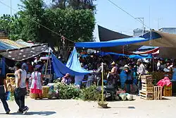 The Thursday Día de Plaza (tianguis), or outdoor market, is Zaachila's weekly main event, which attracts people from various parts of the Valley of Oaxaca, many of whom are Zapotec-speaking peoples from the rural areas. The stalls spread for blocks below the archeological site and the main church. This market tradition dates back to pre-Hispanic times and has changed very little since then.[5][23] This market is divided into three sections. The first is called by the Zapotec name "Logueguindan," which means "plaza of the people of the hills,"[17] and is mostly dedicated to firewood and charcoal for use during the week. This market is located at the entrance to the town, and much of this is from the ocote tree which has a distinctive odor.[5][24] This firewood is obtained from the surrounding hills by native Zapotecs and sold by women, with many of the transactions occurring in the Zapotec language. In addition to firewood, they may offer fruits and vegetables as well. The wood market also sells farming implements such as yokes for oxen. To bring the wood home, there is a service where blue carts pulled by donkeys or horses carry purchases. Although the market has existed for many years, only recently has it been formally organized with an administrator.[17]