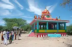 The deities themselves are often represented as aniconic, either as a shapeless stone or tree or snake-hole.[2] In Tamil Nadu, the guardian god is often given form as a fierce warrior, holding an aruval or other weapon, with attendants surrounding him. However Poturaju in Telugu areas is typically represented only by a stick in the ground. In Telugu and Kannada regions, the goddess is often given anthropomorphic form as a terracotta statue only during a temple festival, and is then returned to her aniconic shape. In many villages in Tamil Nadu, a village god is represented by planting spears or trishulas in the ground to represent his martial prowess. In the village of Kogilu near Bengaluru, the goddesses were represented by items such as a lamp or a stone pillar. In many areas of South Karnataka, the village goddess is symbolized by an aarti, a lamp made of rice flour shaped like a cone and adorned with kumkuma in the shape of a face.[3] All these icons are believed to be the deity itself, rather than simply a vessel to hold it.