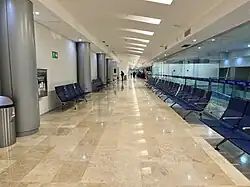 The passenger terminal is a two-story building with a total area of 12,769 square metres (137,440 sq ft). The lower level houses the check-in area, an arrivals hall with two baggage claim carousels, immigration and customs facilities, car rental services, taxi stands, snack bars, a souvenir shop, and a restaurant. The upper floor hosts the security zone and the departure concourse with a commercial area, restaurants, bars, a VIP lounge,[4] and five gates, four of which have jetbridges. The general airport offices are also located on this level. Adjacent to the terminal, other facilities include civil aviation hangars and designated spaces for general aviation.
