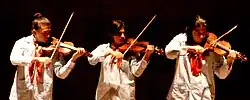 The Villalobos Brothers have been acclaimed as violin virtuosos and one of the leading ensembles of world music.[21][19][37][38] Following a 12 November 2006, concert at Kaufman Center's Merkin Concert Hall in New York City, The Forward noted that "...they played with exuberant intensity for the appreciative audience...Ernesto returned his attention to his violin, his long, dark hair flying through the air as his bow raced across the strings....With their heads bowed as if in prayer, their fingers jumping and feet tapping, they weren't just playing music, they were living it."[21]