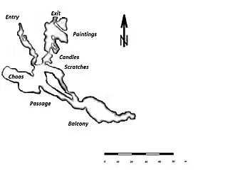 A steep stone staircase, not suitable for people in wheel-chairs, leads down to the new entry which is somewhat below and farther to the northwest then the original one. A 40-metre-long, south-southeast-striking entry passage (galerie d'accés) leads to the crossing (carrefour) where three different passageways diverge from. The branch on the right follows a southeasterly direction and is 130 meters long. It is a combination of rooms and passageways, which begins with the salle de bénitiers (holy water fonts room ), continues in the fairly narrow le passage (passage) and ends in the grand balcon (great balcony) with the grand stalagmite (big stalagmite). The salle de bénitiers also prolongs to the northwest into the salle du chaos (chaos room). The left branch leads to the northeast and north-northeast into the ornate part of the cave. It starts with the 10-metre-long salle des cierges (candle room) where the first paintings were noticed, followed by the 30-metre-long salle des peintures (painting room) with most of the art work. At its far northeastern end is the exit. The 50-metre-long middle branch leads just before the candle room also to the southeast. After the salle des griffades (scratch room) the passage swings into a south-southeasterly direction and therefore meets up again with the right-hand branch just before the great balcony.