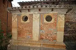 It is placed outside the church. It is just a building with three pillars and decorated with skulls and inscriptions talking about how short life is. Between each pillar there is a hole which gives access to the inside part of the ossuary. Beginning from the left side, the inscriptions say: