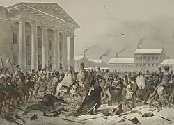 In addition to the regular units, on July 1 an irregular unit of Vilnian burghers was formed in order to carry out police and safekeeping duties within the confines of the city. The unit, named Vilnian National Guard, or Gwardia Narodowa Wileńska in Polish, was composed of 2 battalions.[3] In accordance with the rules for similar units formed in Warsaw, Minsk, Grodno and other towns, the membership was to be limited to all able-bodied men between 18 and 50 years of age, who possessed financial qualifications for the service (two thirds of all the recruits paid for their own equipment and uniform).