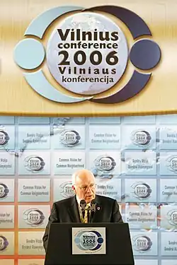 During the Heads of State Summit, the Vice-president of the United States, Dick Cheney, delivered one of the strongest statements concerning George W. Bush administration's position in regards to the current political situation in Russia. Cheney accused the Vladimir Putin government of taking measures that were anti-Democratic, and bullying his neighbors on energy.[1] Cheney praised Lithuania, Latvia and Estonia for making rapid progress towards democracy. The Head of States discussed the situation in Belarus.