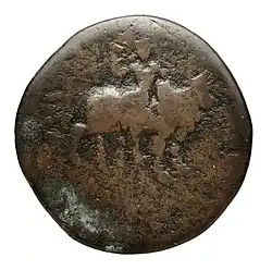 Most of Vima's coins feature the Buddhist symbol of the Triratana on the reverse (or possibly Shiva's symbol for Nandi, the Nandipada), together with Hindu representations of Shiva, with or without his bull. Often time, a Trishul is depicted along with Shiva.