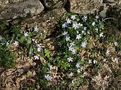 Vinca (/ˈvɪŋkə/;[2] Latin: vincire "to bind, fetter") is an Old World genus of flowering plants in the family Apocynaceae. The English name periwinkle is shared with the related genus Catharanthus (and with the mollusc Littorina littorea). Some Vinca species are cultivated but have also spread invasively. Additionally, some species have medicinal uses. The most widespread species is Vinca minor.