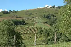 In the 13th century, Augustinian monks from the Roncesvalles Monastery established a vineyard in the Aldudes Valley, with Irouléguy serving as its administrative center.[note 5] Given the mountainous terrain, vines were planted in terraces on the slopes near the Arradoy and Jara rivers.[12] The vineyard's primary function was to provide wine for pilgrims traveling the Camino Francés to Santiago de Compostela.[13]