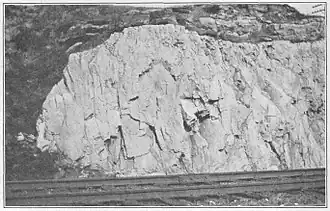 ![]() Upper part of the Vintage Dolomite overlain by Kinzers Shale exposed in cut on the Pennsylvania Railroad near Vintage. This is the type section. | |