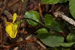 Viola sempervirens, known by the common names redwood violet and evergreen violet, is a species in the genus Viola. It is native to the West Coast of the United States and British Columbia, Canada, and grows in closed-cone pine forest, California mixed evergreen forest, redwood forest, and Douglas fir forest communities. It has leathery purple-spotted green leaves and bright yellow flowers. It blooms in winter and spring.