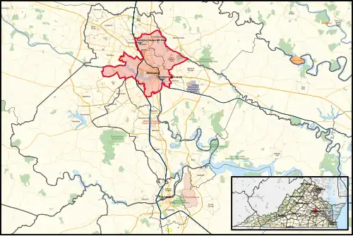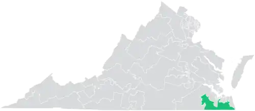 The district overlaps with Virginia's 2nd, 3rd, and 4th congressional districts, and with the 21st, 64th, 75th, 76th, 77th, 78th, 79th, 80th, 81st, and 84th districts of the Virginia House of Delegates.[4] It borders the state of North Carolina.[1]