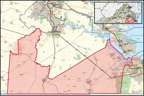 The district overlaps with Virginia's 5th and 7th congressional districts, and with the 25th, 28th, 30th, 54th, 55th, 56th, 57th, 58th, and 88th districts of the Virginia House of Delegates.[4]