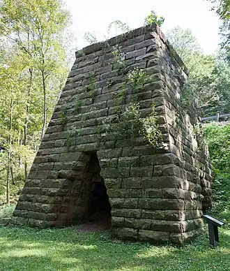 Virginia Furnace, also known as Muddy Creek Furnace and Josephine Furnace, is a historic water powered blast furnace and national historic district located near Albright, Preston County, West Virginia. The district encompasses three contributing structures and one contributing site. The furnace was built in 1854, and was a "charcoal" iron furnace used to smelt iron. It is constructed of cut sandstone, and forms a truncated pyramid measuring approximately 34 feet square in plan and rising about 30 feet. The district includes the nearby wheel pit, blast machinery, and salamander. The furnace remained in operation until the 1890s, and was the last "charcoal" iron furnace to cease operating in northern West Virginia. In 1933, the Virginia Furnace was acquired by the Kingwood Chapter of the Daughters of the American Revolution who created a roadside park at the furnace site.[2]