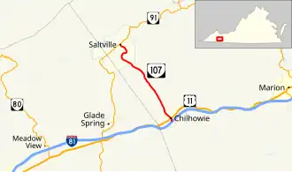 State Route 107 (SR 107) is a primary state highway in the U.S. state of Virginia. The state highway runs 8.39 miles (13.50 km) from Interstate 81 (I-81) in Chilhowie north to SR 91 in Saltville in western Smyth County.