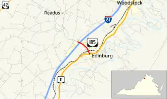 SR 185 begins at a three-way intersection at the southern end of SR 686 (South Ox Road) just west of Edinburg. The road continues west as SR 675 (Stoney Creek Road); that secondary highway has a signed concurrency with SR 185, although the secondary highway is not officially part of the primary highway. SR 185 heads southeast through a diamond interchange with I-81 and enters the town of Edinburg running parallel to Stony Creek to the south. The state highway has a grade crossing of Norfolk Southern Railway's B-Line before reaching its eastern terminus at US 11 (Main Street) at the west end of downtown Edinburg.[1][2]