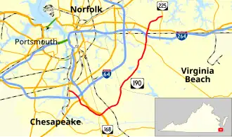 State Route 190 (SR 190) is a primary state highway in the U.S. state of Virginia. The state highway runs 15.43 miles (24.83 km) from SR 166 in Chesapeake east and north to SR 225 in Virginia Beach. SR 190 is a J-shaped route that connects the central part of Chesapeake with the western part of Virginia Beach.