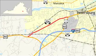State Route 226 (SR 226) is a primary state highway in the U.S. state of Virginia. Known as Cox Road, the state highway runs 3.38 miles (5.44 km) from U.S. Route 460 (US 460) near Sutherland east to US 1 and US 460 Business near Petersburg. SR 226 is the old alignment of US 460 in northeastern Dinwiddie County.
