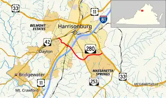 State Route 280 (SR 280) is a primary state highway in the U.S. state of Virginia. The highway runs 5.0 miles (8.0 km) from SR 42 in Harrisonburg east to U.S. Route 33 (US 33) in Massanetta Springs in central Rockingham County. SR 280 is a four-lane southern bypass of Harrisonburg that connects SR 42 and US 33 with US 11 and SR 253 outside of the city core.