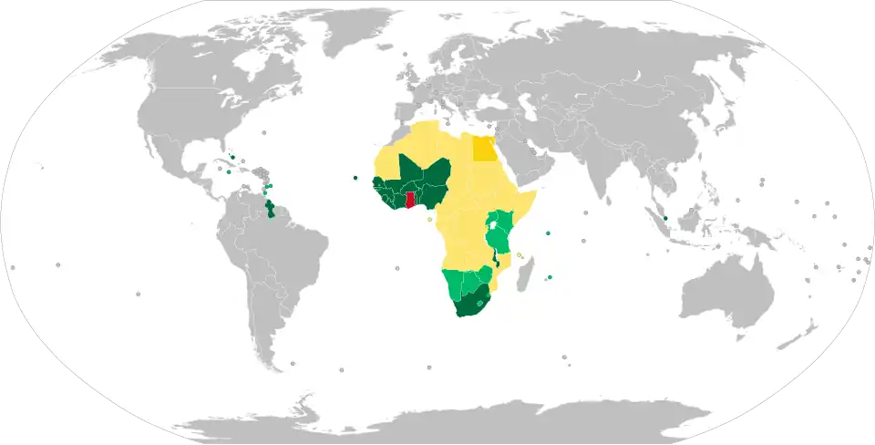Citizens of the following countries and territories are not required to obtain a visa to enter Ghana, for a stay up to the duration listed below:[1][2]