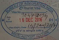- ^ "Tourist Visa on Arrival". Bureau of Immigration (India). Archived from the original on 16 August 2015. Retrieved 17 September 2017.