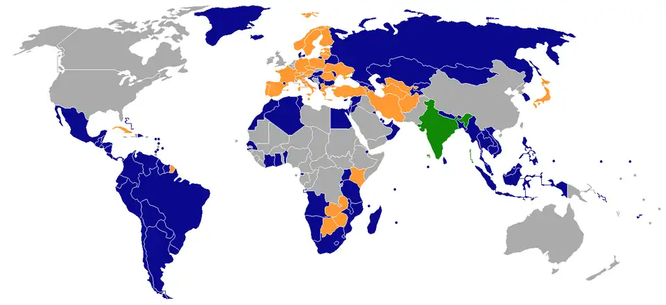 Under reciprocal agreements, holders of diplomatic or various types of passports (consular, official, service and special) of the following countries and territories may enter and remain in India without a visa for the following period:[3]