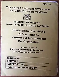 Proof of Yellow fever vaccination is required for all travellers travelling through or from the following countries: Angola, Argentina, Benin, Bolivia, Brazil, Burkina Faso, Burundi, Cameroon, Central African Republic, Chad, Colombia, Republic of the Congo, Democratic Republic of the Congo, Côte d'Ivoire, Ecuador, Equatorial Guinea, Ethiopia, French Guiana, Gabon, Gambia, Ghana, Guinea, Guinea-Bissau, Guyana, Kenya, Liberia, Mali, Mauritania, Niger, Nigeria, Panama, Paraguay, Peru, Rwanda, Senegal, Sierra Leone, South Sudan, Sudan, Suriname, Togo, Trinidad and Tobago, Uganda, Venezuela, Zambia.[18][19] The Tanzanian ministry of health mandates a transit time of more than 12 hours or a disembarkment from the immediate airport area from the above mentioned countries during transit as a possible health threat and requires travelers in such situations to possess Yellow Fever Certificates.[20]