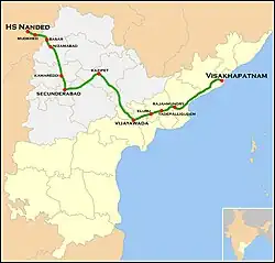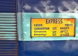 The Nanded–Visakhapatnam Express (previously Nizamabad–Visakhapatnam Express) is an Express Train service connecting the cities of Nanded, Maharashtra and Visakhapatnam in the Indian state of Andhra Pradesh.[1] It is jointly operated by the South Central Railway and South Coast Railway zones of the Indian Railways. This is a non-daily service which runs on Tuesdays, Wednesdays and Saturdays. The train number 20811 runs from Visakhapatnam to Nanded and the train 20812 runs from Nanded to Visakhapatnam on Sundays, Wednesdays and Thursdays.