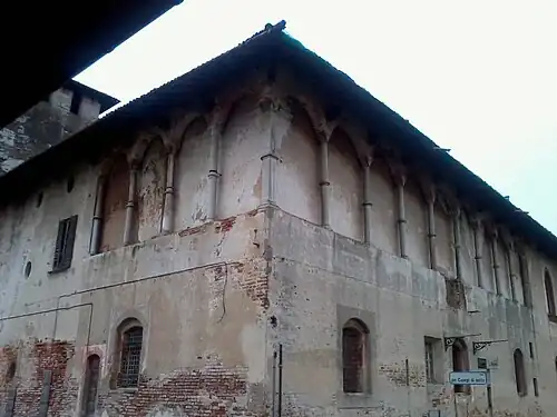 Bernabò Visconti was lord of Milan between 1354 and 1385. He ordered the construction of the castle of Cusago in 1370. It had a quadrilateral layout, and a single tower over the entrance, features conserved until today. It was created as a country residence and connected to a hunting park.[1] The most extended side measured 96 meters.[2]