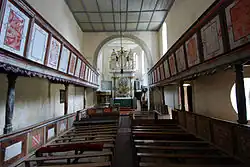In the 14th century the church became a community church. The apse was replaced by a larger trapezoidal choir. The church was fortified around 1500: the hall was lengthened and linked to the keep, formerly freestanding and probably belonging to the family of a count. Another level was added to the keep, used for bells and fitted with a battlement that stayed on corbels. The roof featured a sixth level with embrasures for firing. The choir's defensive level was demolished in 1743. Due to the peaceful nature of the period, the church battlement was taken down after that time, replaced by grain storerooms for the villagers. The interior ceiling has a ceiling divided into squares, also from 1743, around which time the austere furnishings were put in place.[5]