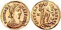 From c. 450 the Visigoths produced imitations of the coins of Valentinian III (425-455). One type of solidus and two types of tremissis were issued under his name. The solidus is catalogued as MEC 167-9, and copies a coin of the same value, Cohen VIII 212, 19. The obverse shows a portrait of the emperor facing right, with diadem, mantle and armour. On the reverse the emperor stands with a foot on a serpent with a human head. In his right hand he holds a cross, and in his left a globe supporting a Victory.[8][9]