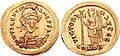 The solidi minted in this period bear the names of the Byzantine emperors Anastasius I (491-518), Justin I (518-527) and Justinian I (527-565). They are distinguished from imperial issues by style, and other imitations by being exclusively found in the Iberian peninsula.[12] The most common reverse types are: with a standing Victory holding a cross, above a letter rho, and a type with a Victory facing right, holding a palm, and raising a crown with her other hand.[12]