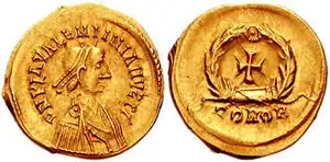 The most probable mint for these issues is Toulouse,[3] in South Gaul, the royal capital. It is thought that there was also a mint at Narbonne,[3] where in 414 Ataulf married Galla Placidia, sister of Honorius. This hypothesis arises from a solidus, now lost, but published in the 18th century, minted in the name of Priscus Attalus, a puppet emperor supported by Ataulf.[3][4] This coin bears the mintmark "NB", which may indicate Narbonne.[3] A mint at Narbonne is also referenced in a poem of Sidonius Apollinaris (carmen 23)[5] of 460, but under imperial control - as no issues from such a mint are known this may be poetic license.[3] Narbonne definitely had a mint during the reign of Liuvigild in the late 6th century, but minting likely already started in 507, when the city became the capital of the Visigothic Kingdom.[3]