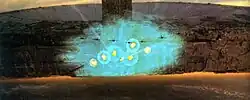 VisionArt's claim to fame on the big screen was arguably its creation of the majority of the dogfight sequences for Independence Day, which won the Academy Award for Best Visual Effects.[7] Sparky, a dynamics/simulation software developed by Rob Bredow, director of research and development, along with Pete Shinners, was heavily expanded to provide for near-real-time animation of large groups of F-18 jet fighters, alien attackers, missiles, smoke trailers, shields, etc.[3] While previous shots of similar complexity animated by other means had taken about one month each, Sparky was also able to render the frames in hardware anti-aliased at film resolution at just one minute per frame, allowing the delivery of two shots per day.[8] While traditional animation was effective when a handful of aircraft was involved, digital effects supervisor Tricia Ashford noted that the technique would be "too laborious for the frenetic dogfight that concludes Independence Day."[8] "The final air battle takes place around a fifteen-mile-wide destroyer," remarked Ashford, "and Roland wanted to see hundreds of F-18s and attackers duking it out with missiles, light balls, and tracer fire. It was an enormous challenge; the only way it could be accomplished was through an advanced procedural system that could automatically calculate and render the interaction between all these different elements."[8] VisionArt demonstrated such a system to Roland Emmerich and his team, who loved it. "VisionArt had a tremendous system to begin with," stated Ashford, "and then they were able to adapt it to meet the needs of our show."[8] In a 1996 interview for SIGGRAPH, writer Dean Devlin stated "When we were shown the software that was developed at VIsionArt, where we could just slide a little bar and add more F-18's and more alien attackers... the ease in which were able to create these shots, and the flexibility – I don't think that we could have done these sequences without it."[9] Rob Bredow modified Sparky "to simulate the behavioral characteristics of an aerial dogfight involving hundreds of planes and attackers."[8] Initially, the US Navy was open to providing data on the flight characteristics of the F-18, but the Pentagon wanted Emmerich to strike all reference to Area 51 from the film. Given the centrality of Area 51 to UFO folklore, Emmerich refused. Fortunately, the Royal Australian Air Force had no qualms about references to Area 51, and happily provided the needed data. Director Roland Emmerich and writer Dean Devlin then provided the equivalent fictional characteristics for the alien attackers. "Once the capabilities of the planes and alien attackers were established, Bredow and software engineers Randi Stern and Brian Hall developed a range of prioritized objectives for each. an F-18, for example, might have the objective of attacking the destroyer, unless an alien attacker entered a zone that triggered evasive action."[8] Rules were also established so that planes and attackers would bank away from and keep clear of the 3D space that would be occupied by the destroyer once it was composited into the shot.[8] In the end, Independence Day shattered box office records, grossing over US$817 million worldwide, and won the 1996 Academy Award for Best Visual Effects.